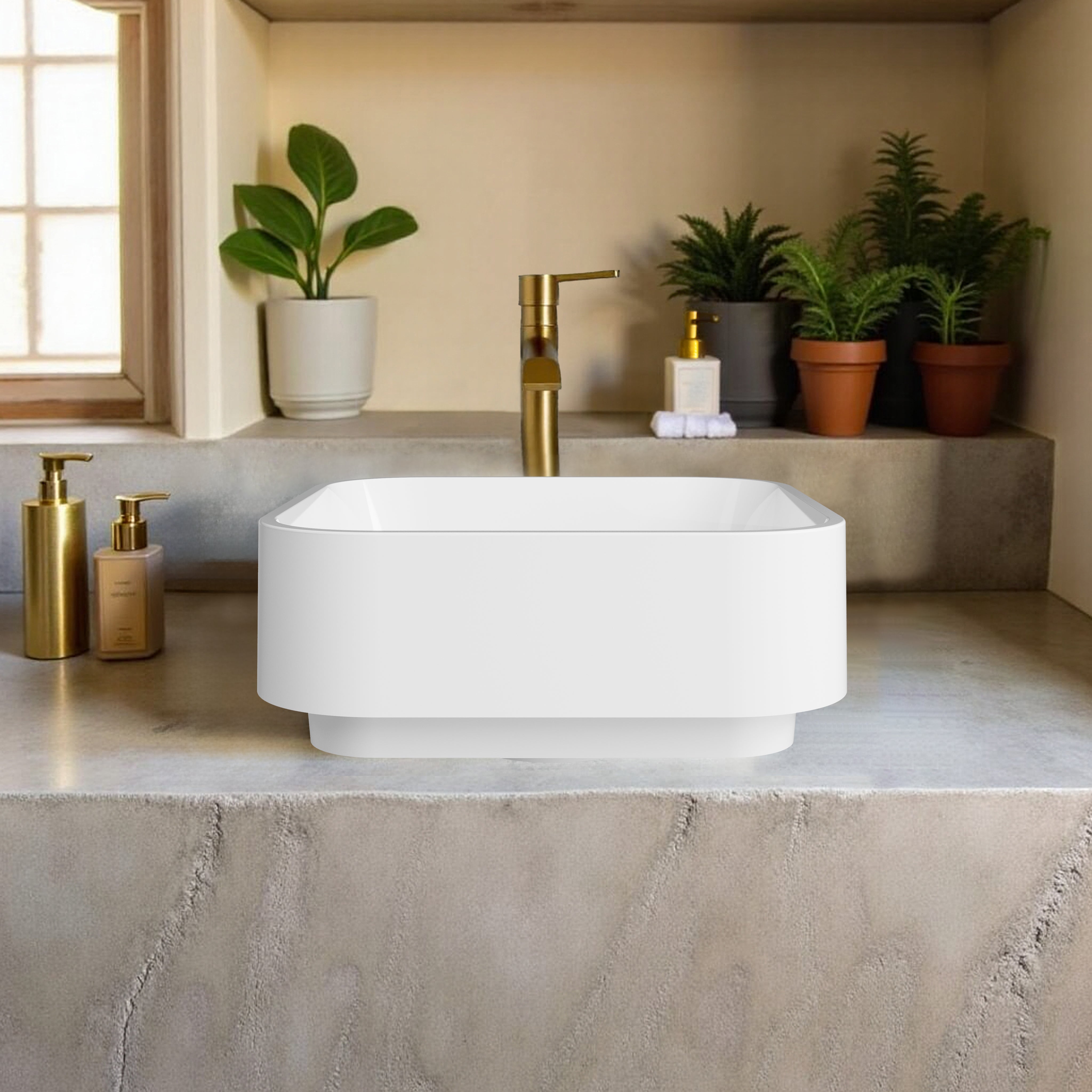 The AC snow white countertop sink brings minimalist elegance and everyday functionality to your bathroom. Available in both a silky matte finish and a radiant glossy finish, this sink offers two distinct yet equally stunning expressions of modern style and includes a matching white drain cover for a seamless look.