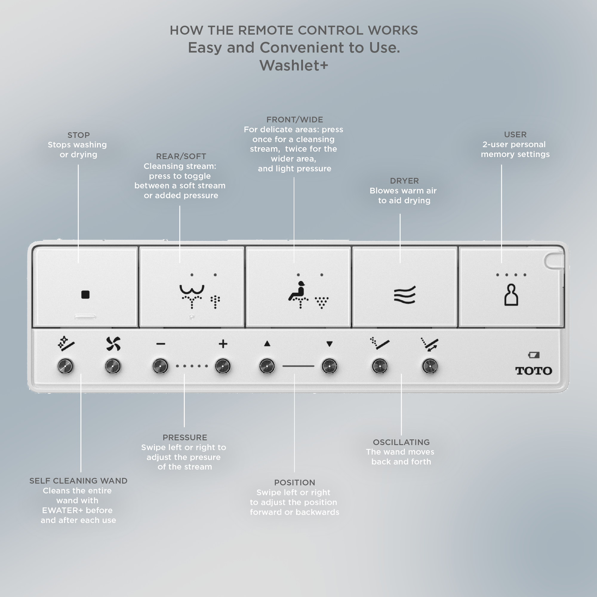 - EMBRACE YOUR UNIQUENESS - The convenient remote allows users to control and set personalized water cleansing settings. Provides luxury and cleanliness at your fingertips; 4 user memory settings for quick access
